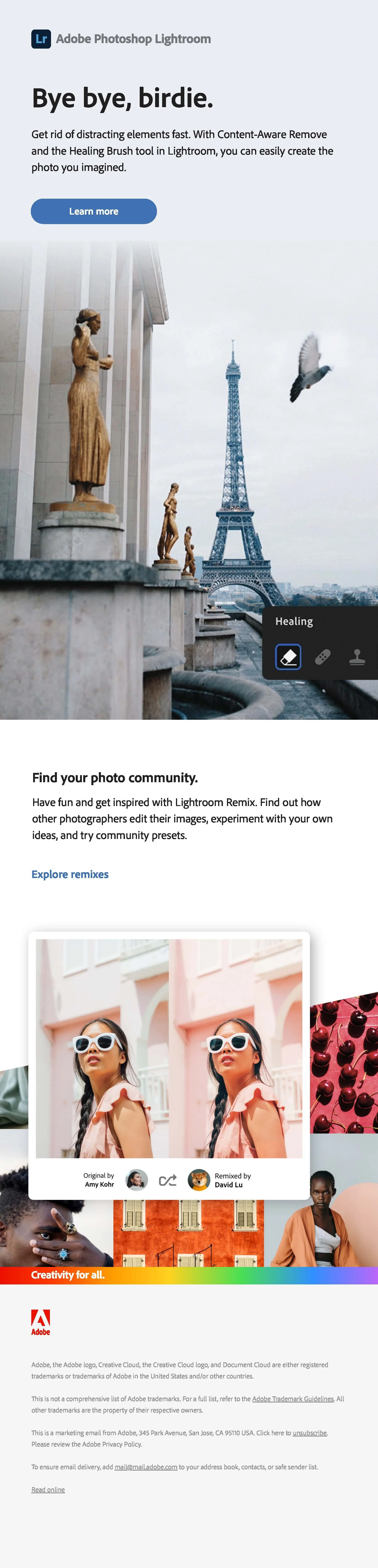 In partnership with Adobe Marketing and Brand Studio teams, I oversaw the development and execution of Adobe email marketing across the customer lifecycle: trial and purchase; welcome and onboarding; engagement, active and lapsed users.
