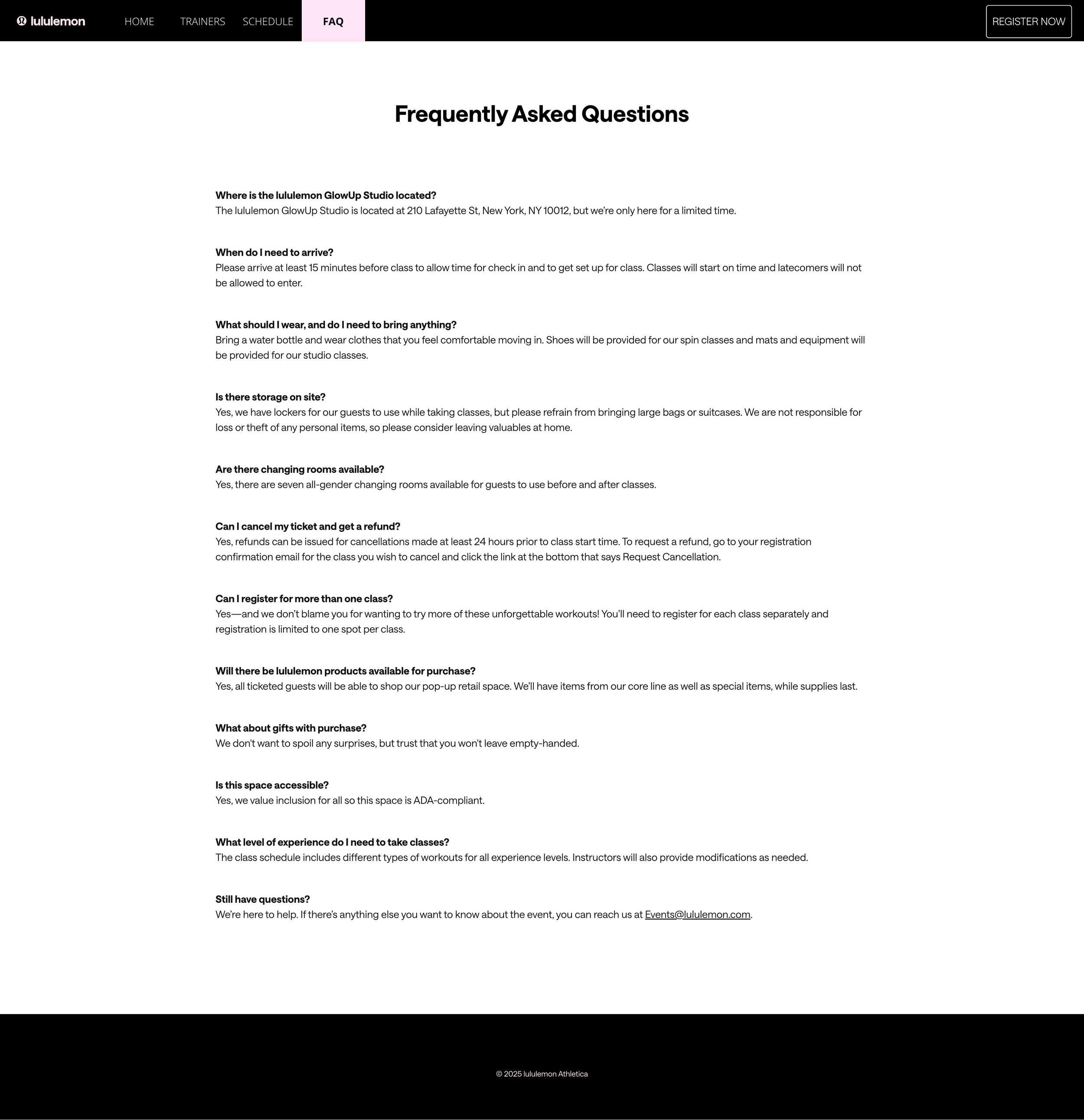 lululemon introduced the world to their new GlowUp product line with a a two-week pop-up studio experience in New York. In collaboration with their creative team and experiential agency, I created the copy for the event website which served as the hub for all info about the event including the schedule of programming, class descriptions, and registration access.